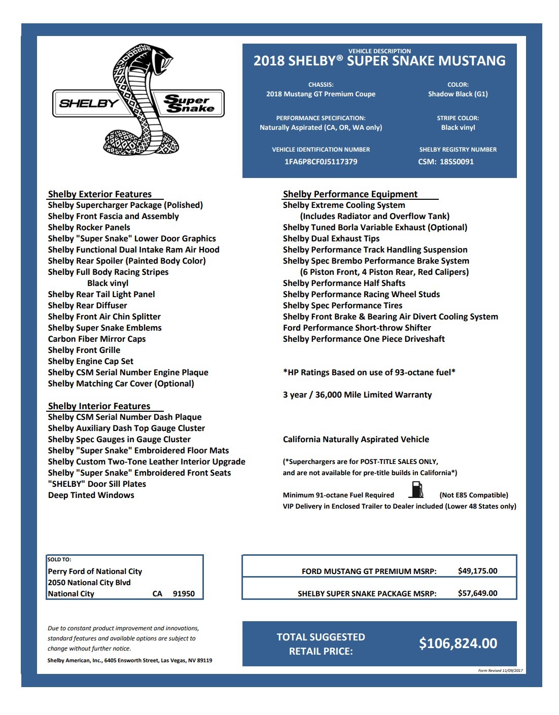 (Ford Mustang GT Premium MSRP: $49,175 + Shelby Super Snake Package MSRP: $57,649)